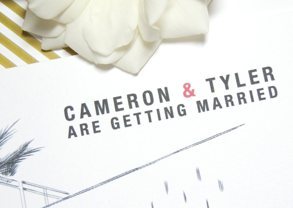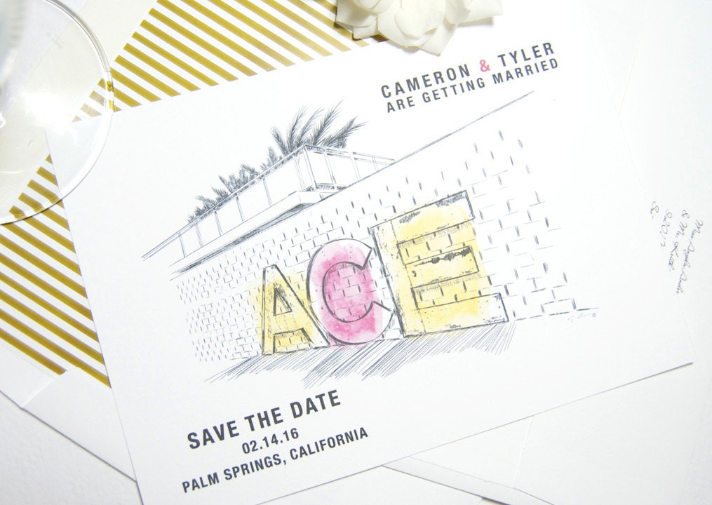 Ace Hotel Palm Springs Destination Wedding Hand Drawn Skyline Save the Date Cards (set of 25 cards and white envelopes)