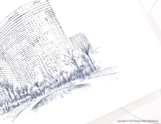 Our exclusive MagicWand artist in residence has captured the historical and contemporary beauty of the Aria Hotel, Las Vegas as seen like no other in our beautiful destination wedding invitations. Our Skylines are exquisitely and exclusively drawn for MagicWand Weddings. Our designs are also used by Celebrity Event Planners who love our creativity to create luxurious one of a kind designs. We offer font changes and font color options at no additional charge…just ask! This design is also available in day of event paper such as, place cards, menu cards, table numbers and wedding programs.