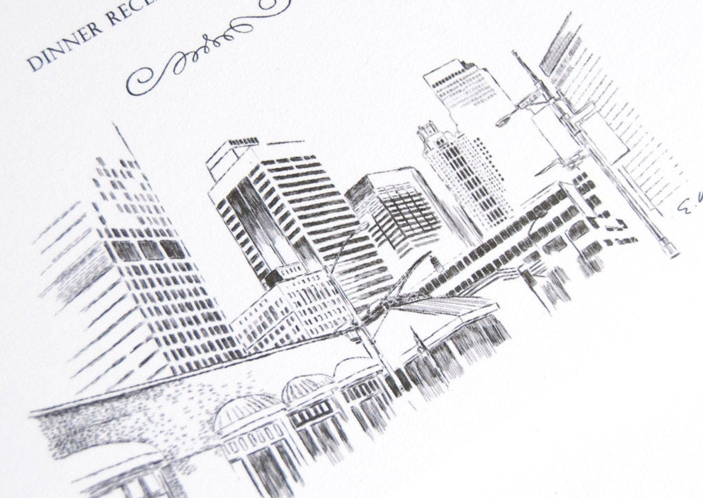 Our exclusive MagicWand artist in residence has captured the historical and contemporary beauty of the Atlanta, Georgia Skyline Wedding as seen like no other in our beautiful wedding invitations. Our Skylines are exquisitely and exclusively drawn for MagicWand Weddings. Our designs are also used by Celebrity Event Planners who love our creativity to create luxurious one of a kind designs. We offer font changes and font color options at no additional charge…just ask! This design is also available in day of event paper such as, place cards, menu cards, table numbers and wedding programs.