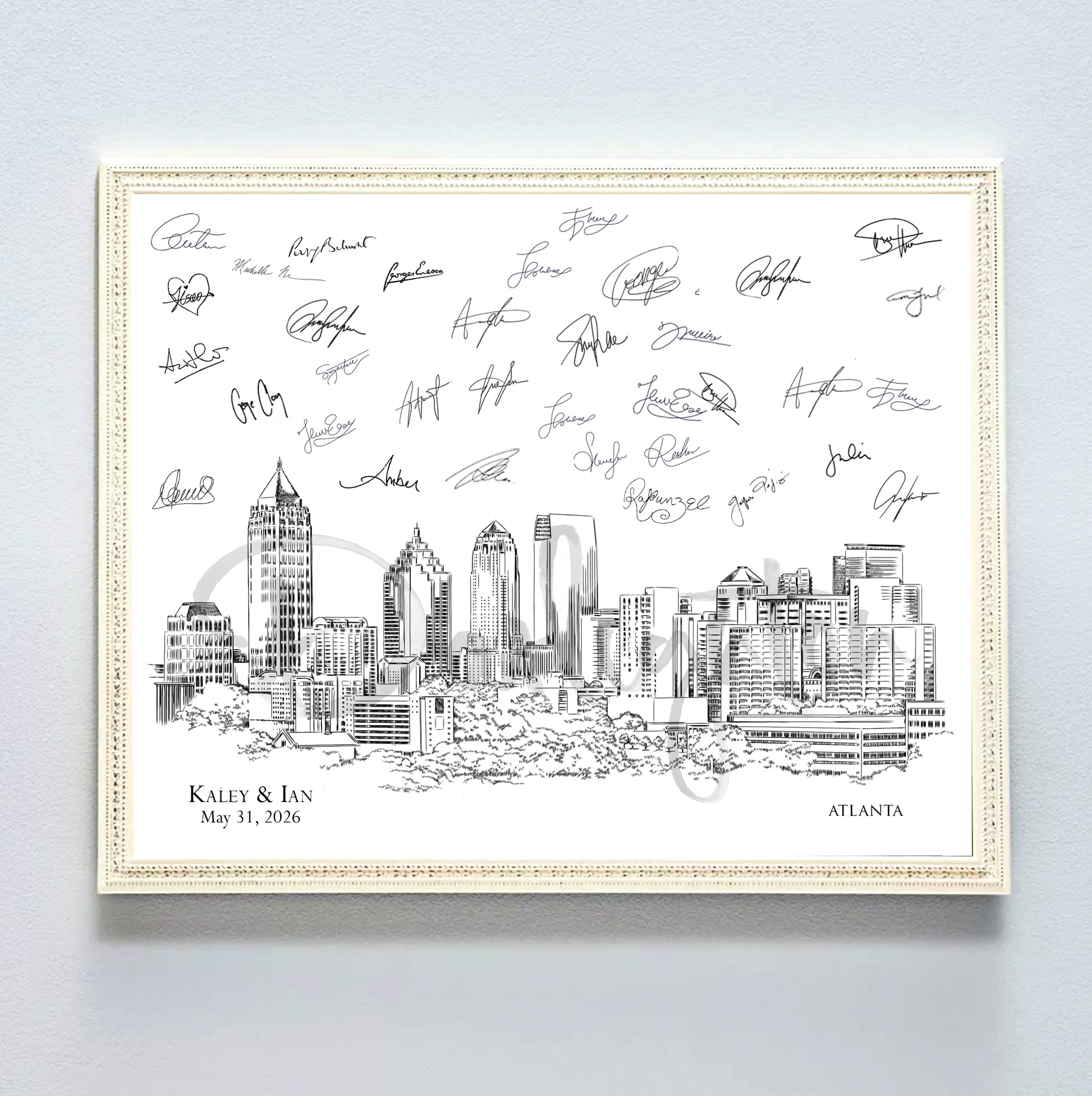 Professionally hand-drawn, like the Renaissance masters of art, your Atlanta Skyline Guestbook print is sophisticated and fun. Your guests will enjoy an interactive experience to provide you signatures of your guests to commemorate your very special day. The drawings are exquisite artwork, suitable for framing to be appreciated with memories for years to come.