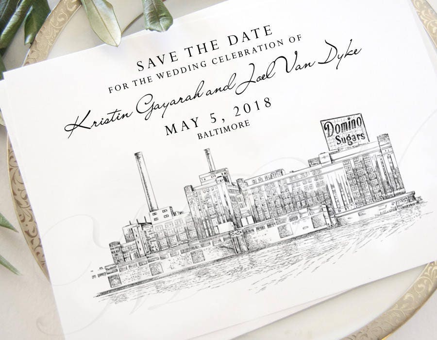 Baltimore Skyline Save the Dates, Save the Date Cards, Wedding, STD, Baltimore Wedding, Save the Date, Maryland, Domino Sugar Building