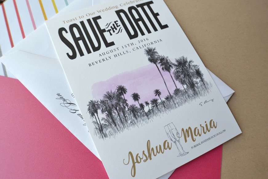 Our exclusive MagicWand artist in residence has captured the historical and contemporary beauty of the Beverly Hills Skyline as seen like no other in our beautiful Save the Dates. Our Skylines are exquisitely and exclusively drawn for MagicWand Weddings. Our designs are also used by Celebrity Event Planners who love our creativity to create luxurious one of a kind designs. We offer font changes and font color options at no additional charge…just ask! This design is also available in wedding invitations, rehearsal dinner invitations and day of event paper such as, place cards, menu cards, table numbers and wedding programs.