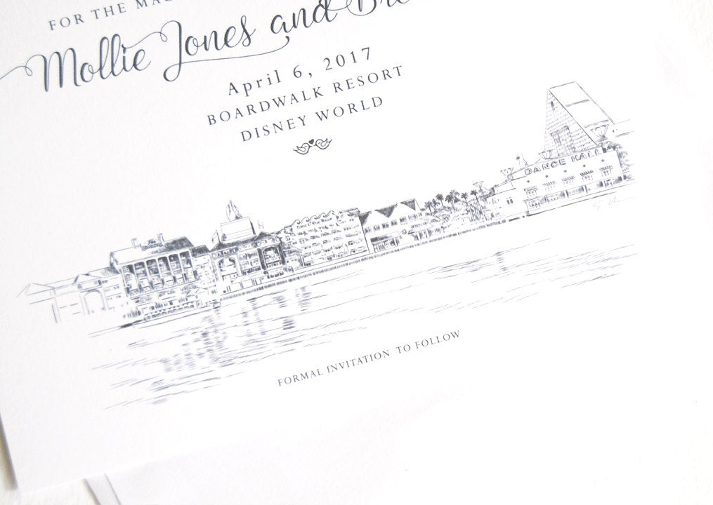 MagicWand Save the Dates are not only special wedding announcements of your big day, but are also a beautiful piece of stunning artwork guests will love. Through classically trained renaissance-style artists, MagicWand has recreated a neo-classic sophistication providing brides an unprecedented option. Artists in residence capture the historical soul and contemporary beauty of the Disney World's Boardwalk Resort Skyline as seen like no other. Our artwork is favored by many Celebrity Event Planners who absolutely love our creativity and always comment, guests will receive these and say "it's like receiving a piece of artwork in the mail, and they will want to frame it.”