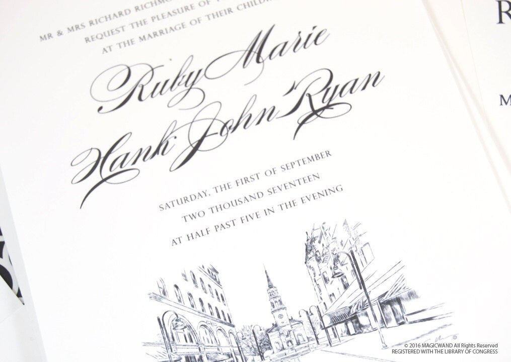 Our exclusive MagicWand artist in residence has captured the historical and contemporary beauty of Burlington skyline as seen like no other in our beautiful wedding invitations. Our Skylines are exquisitely and exclusively drawn for MagicWand Weddings. Our designs are also used by Celebrity Event Planners who love our creativity to create luxurious one of a kind designs. We offer font changes and font color options at no additional charge…just ask! This design is also available in day of event paper such as, place cards, menu cards, table numbers and wedding programs.
