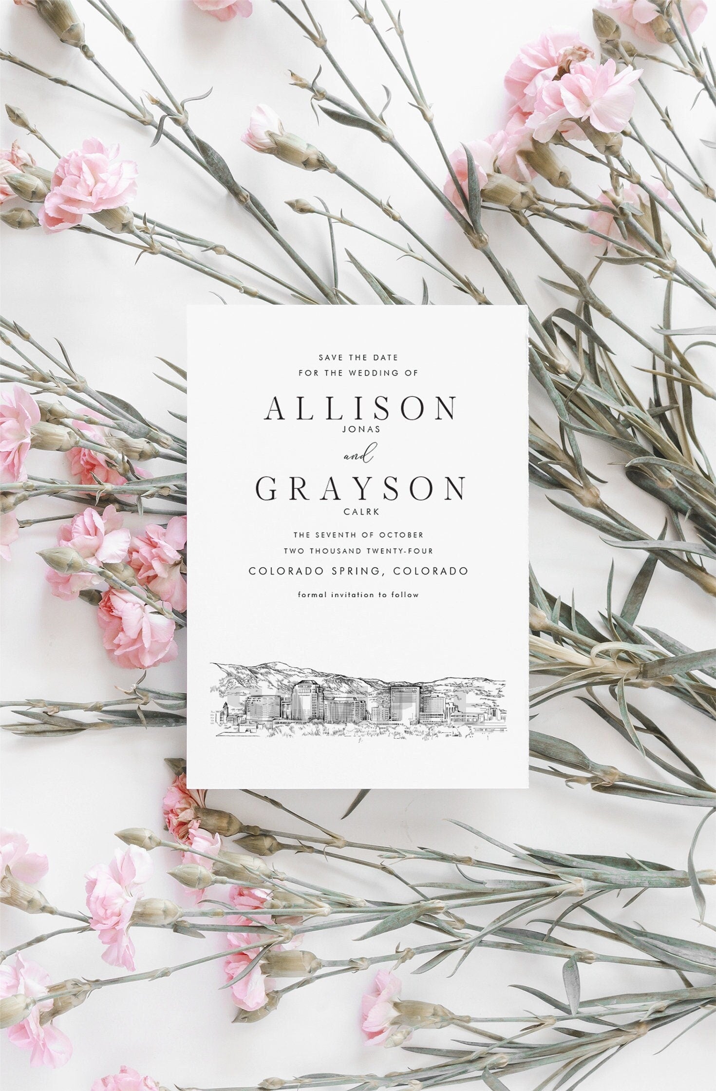 Our exclusive MagicWand artist in residence has captured the historical and contemporary beauty of the COLORADO SPRINGS Skyline as seen like no other in our beautiful Save the Dates. Our Skylines are exquisitely and exclusively drawn for MagicWand Weddings. Our designs are also used by Celebrity Event Planners who love our creativity to create luxurious one of a kind designs. We offer font changes and font color options at no additional charge…just ask! This design is also available in wedding invitations, rehearsal dinner invitations and day of event paper such as, place cards, menu cards, table numbers and wedding programs.