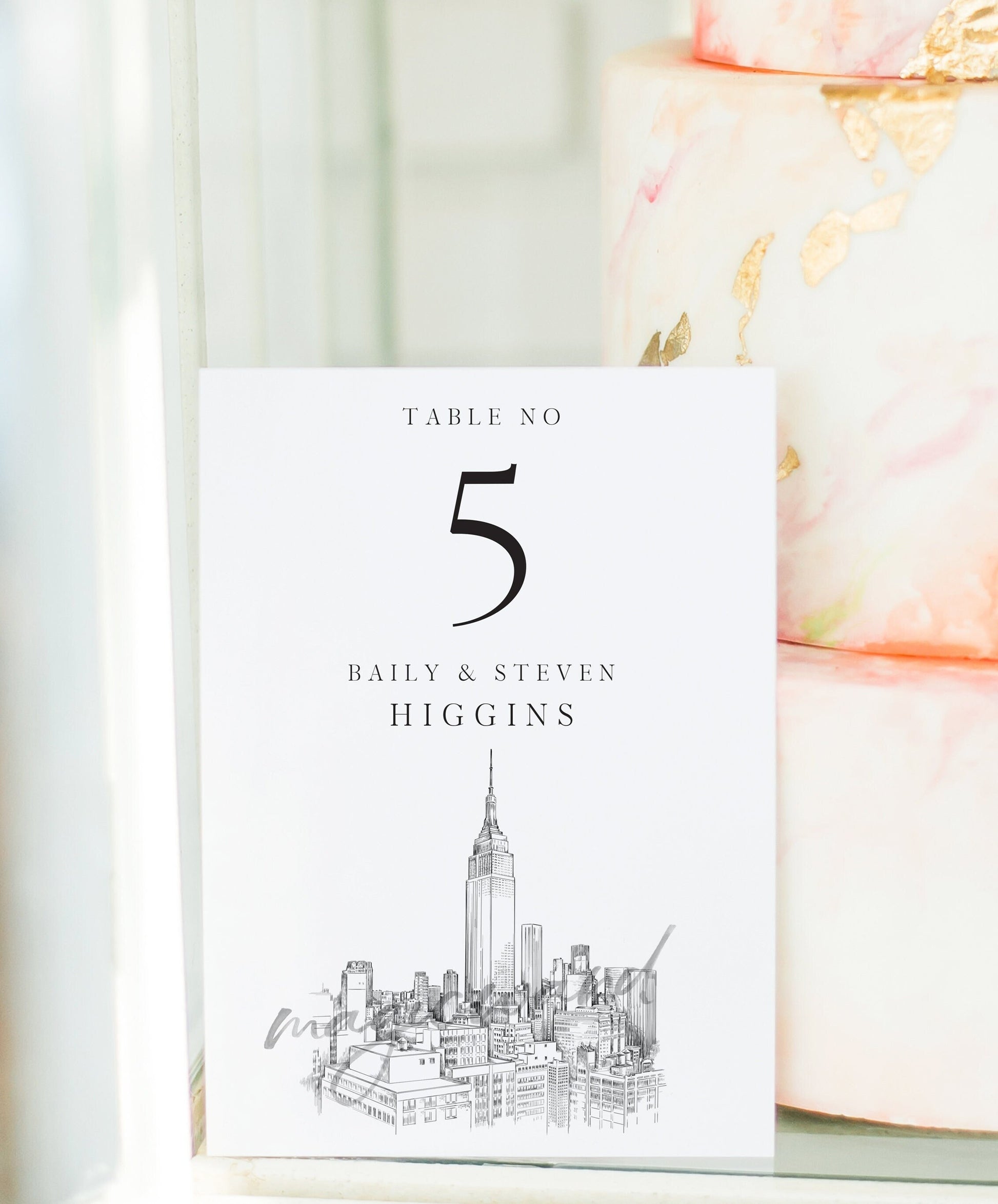 These elegant custom New York Skyline Table Numbers are perfect for a perfect finishing touch to your wedding. Customize with the Bride & Grooms names and Wedding Date. Use them to stand alone or we use a standard picture frame size of 5 x7 if you choose to frame them. Professionally printed on our high end 165# matte bright white paper and using a high quality commercial press that results in the highest of quality results. (Table numbers are sold in sets of 10, if you need 20 table numbers enter a quantity of 2 to yield 20 table numbers, etc.)