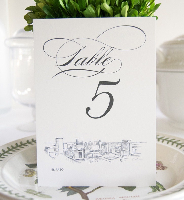 These elegant El Paso Skyline Table Numbers are perfect for a perfect finishing touch to your wedding. Use them to stand alone or we use a standard picture frame size of 5 x7 if you choose to frame them. Professionally printed on our high end 130# matte bright white paper and using a high quality commercial press that results in the highest of quality results. (Table numbers are sold in sets of 10, if you need 20 table numbers enter a quantity of 2 to yield 20 table numbers, etc.)