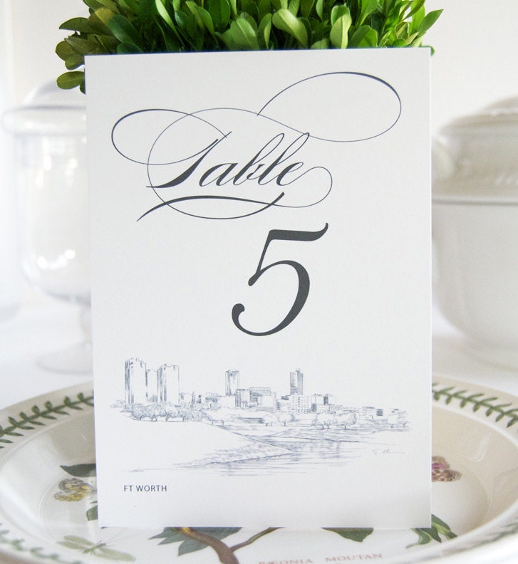 These elegant Fort Worth Skyline Table Numbers are perfect for a perfect finishing touch to your wedding. Use them to stand alone or we use a standard picture frame size of 5 x7 if you choose to frame them. Professionally printed on our high end 130# matte bright white paper and using a high quality commercial press that results in the highest of quality results. (Table numbers are sold in sets of 10, if you need 20 table numbers enter a quantity of 2 to yield 20 table numbers, etc.)