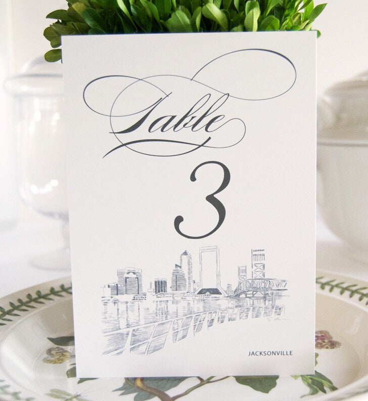 These elegant Jacksonville Skyline Table Numbers are perfect for a perfect finishing touch to your wedding. Use them to stand alone or we use a standard picture frame size of 5 x7 if you choose to frame them. Professionally printed on our high end 130 pound matte bright white paper and using a high quality commercial press that results in the highest of quality results. (Table numbers are sold in sets of 10, if you need 20 table numbers enter a quantity of 2 to yield 20 table numbers, etc.)
