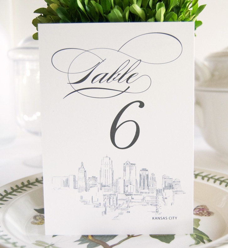 These elegant Kansas City Skyline Table Numbers are perfect for a perfect finishing touch to your wedding. Use them to stand alone or we use a standard picture frame size of 5 x7 if you choose to frame them. Professionally printed on our high end 130 pound matte bright white paper and using a high quality commercial press that results in the highest of quality results. (Table numbers are sold in sets of 10, if you need 20 table numbers enter a quantity of 2 to yield 20 table numbers, etc.)