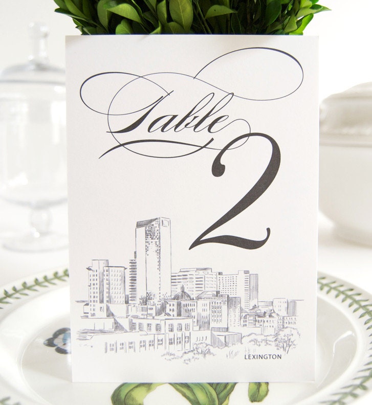 These elegant Lexington Skyline Table Numbers are perfect for a perfect finishing touch to your wedding. Use them to stand alone or we use a standard picture frame size of 5 x7 if you choose to frame them. Professionally printed on our high end 130 pound matte bright white paper and using a high quality commercial press that results in the highest of quality results. (Table numbers are sold in sets of 10, if you need 20 table numbers enter a quantity of 2 to yield 20 table numbers, etc.)