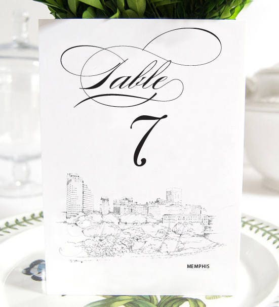 These elegant Memphis Skyline Table Numbers are perfect for a perfect finishing touch to your wedding. Use them to stand alone or we use a standard picture frame size of 5 x7 if you choose to frame them. Professionally printed on our high end 165lb heavy matte bright white paper and using a high quality commercial press that results in the highest of quality results. (Table numbers are sold in sets of 10, if you need 20 table numbers enter a quantity of 2 to yield 20 table numbers, etc.)