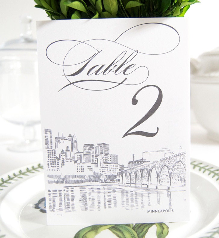 These elegant Minneapolis Skyline Table Numbers are perfect for a perfect finishing touch to your wedding. Use them to stand alone or we use a standard picture frame size of 5 x7 if you choose to frame them. Professionally printed on our high end 130 pound matte bright white paper and using a high quality commercial press that results in the highest of quality results. (Table numbers are sold in sets of 10, if you need 20 table numbers enter a quantity of 2 to yield 20 table numbers, etc.)