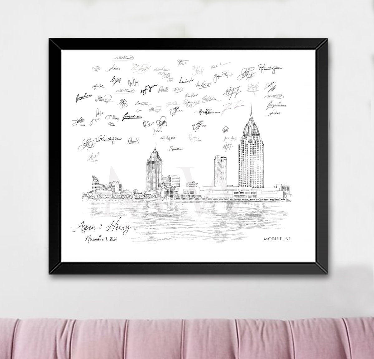 Professionally hand-drawn, like the Renaissance masters of art, your Mobile, AL Skyline Guestbook print is sophisticated and fun. Your guests will enjoy an interactive experience to provide you signatures of your guests to commemorate your very special day. The drawings are exquisite artwork, suitable for framing to be appreciated with memories for years to come.
