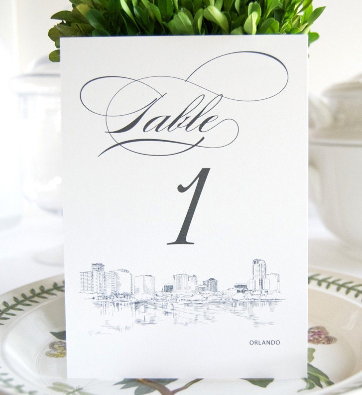 These elegant Orlando Skyline Table Numbers are perfect for a perfect finishing touch to your wedding. Use them to stand alone or we use a standard picture frame size of 5 x7 if you choose to frame them. Professionally printed on our high end 130 pound matte bright white paper and using a high quality commercial press that results in the highest of quality results. (Table numbers are sold in sets of 10, if you need 20 table numbers enter a quantity of 2 to yield 20 table numbers, etc.)