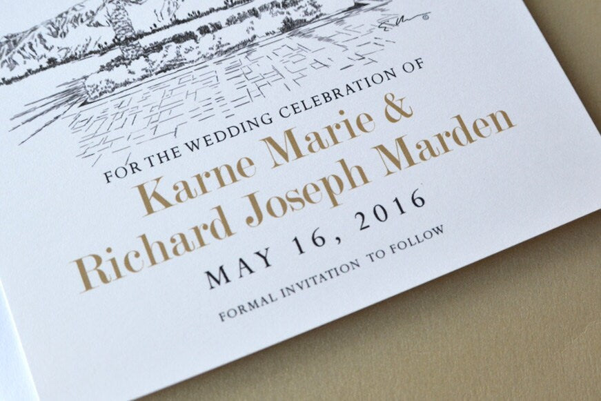 Our exclusive MagicWand artist in residence has captured the historical and contemporary beauty of the Palm Springs Skyline as seen like no other in our beautiful Save the Dates. Our Skylines are exquisitely and exclusively drawn for MagicWand Weddings. Our designs are also used by Celebrity Event Planners who love our creativity to create luxurious one of a kind designs. We offer font changes and font color options at no additional charge…just ask! This design is also available in wedding invitations, rehearsal dinner invitations and day of event paper such as, place cards, menu cards, table numbers and wedding programs.