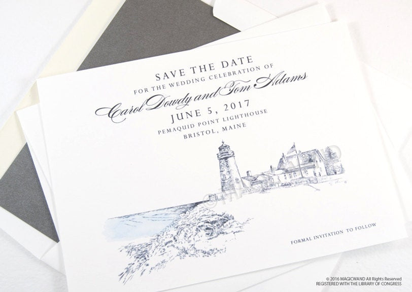 Pemaquid Point Lighthouse Wedding Save the Date Cards, Save the Dates, Bristol Maine Wedding, Hand Drawn (set of 25 cards)
