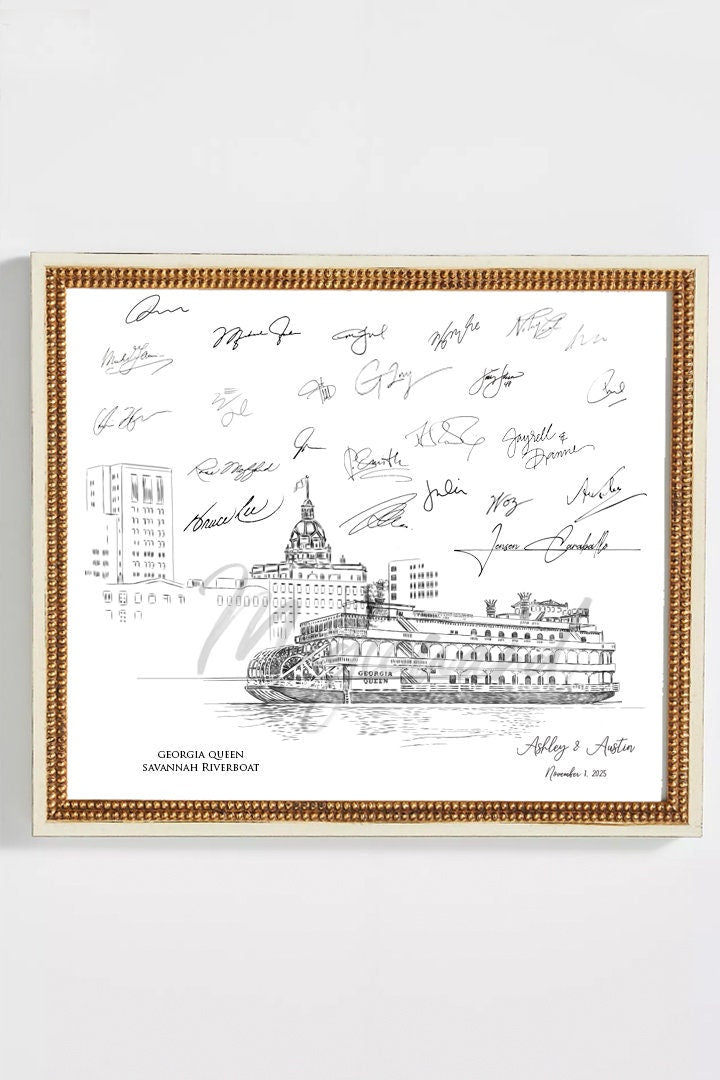 Professionally hand-drawn, like the Renaissance masters of art, your Savannah Georgia Queen Steamboat Guestbook print is sophisticated and fun. Your guests will enjoy an interactive experience to provide you signatures of your guests to commemorate your very special day. The drawings are exquisite artwork, suitable for framing to be appreciated with memories for years to come.
