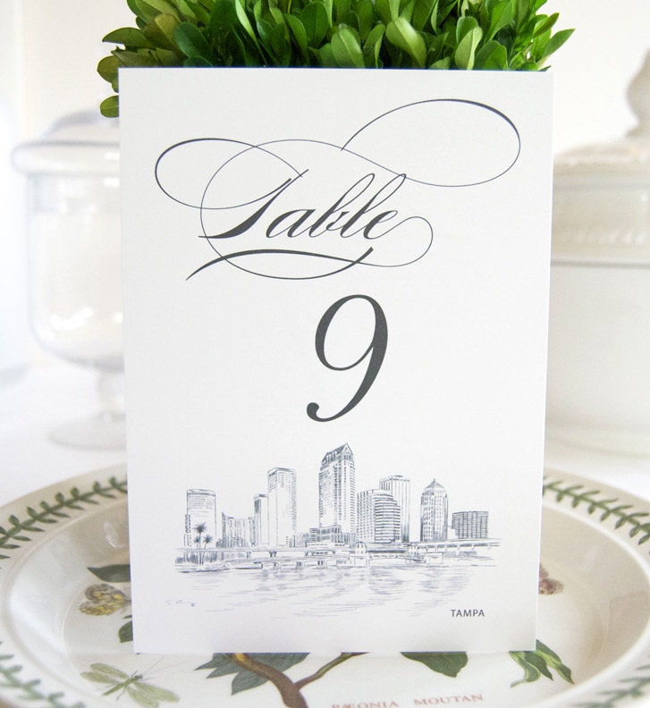 These elegant Tampa Skyline Table Numbers are perfect for a perfect finishing touch to your wedding. Use them to stand alone or we use a standard picture frame size of 5 x7 if you choose to frame them. Professionally printed on our high end 130# matte bright white paper and using a high quality commercial press that results in the highest of quality results. (Table numbers are sold in sets of 10, if you need 20 table numbers enter a quantity of 2 to yield 20 table numbers, etc.)