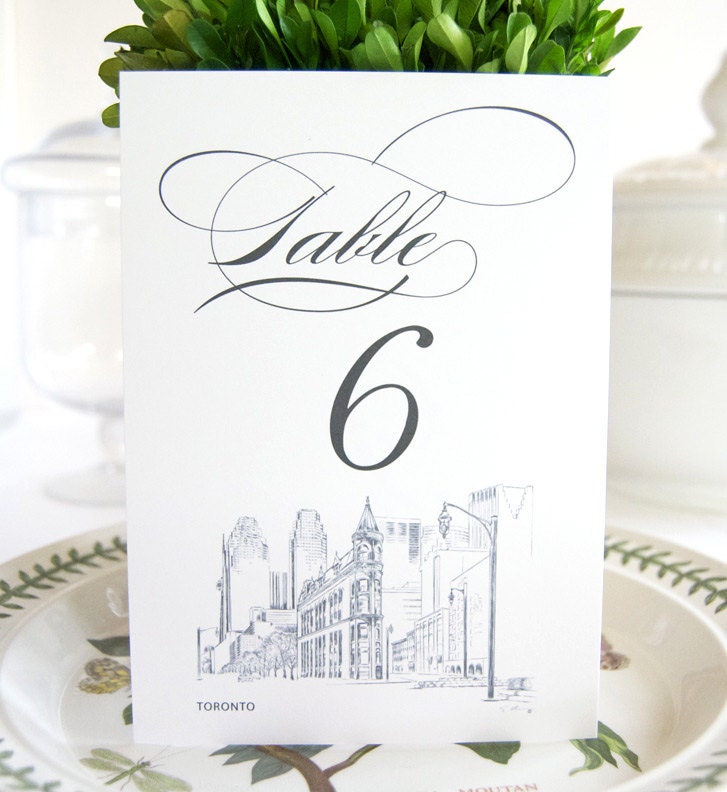 These elegant Toronto Skyline Table Numbers are perfect for a perfect finishing touch to your wedding. Use them to stand alone or we use a standard picture frame size of 5 x7 if you choose to frame them. Professionally printed on our high end 130# matte bright white paper and using a high quality commercial press that results in the highest of quality results. (Table numbers are sold in sets of 10, if you need 20 table numbers enter a quantity of 2 to yield 20 table numbers, etc.)