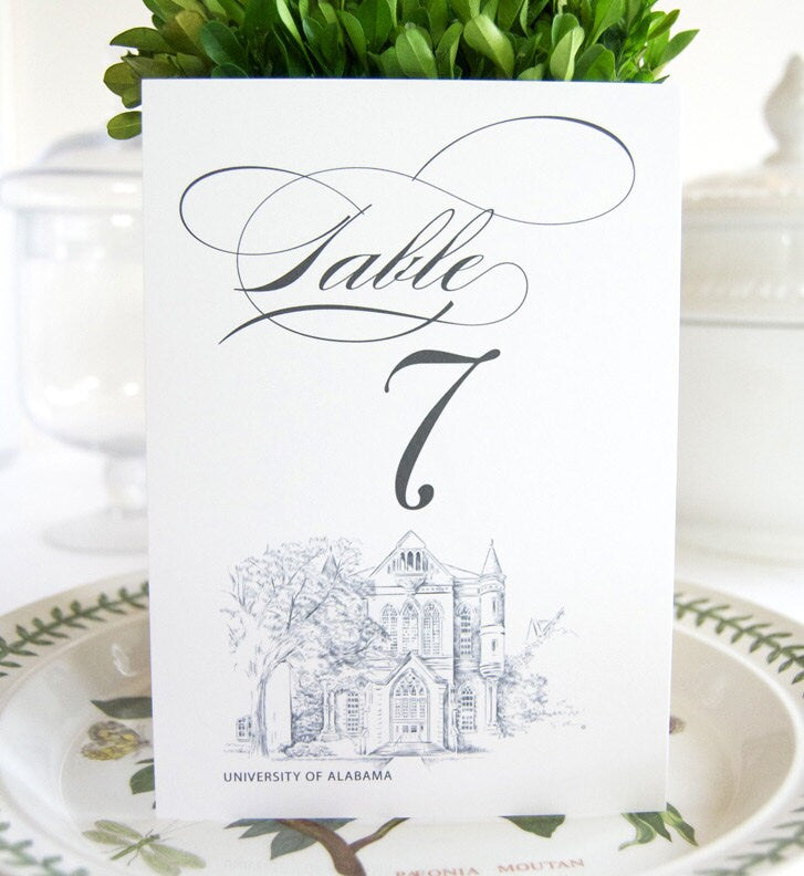 These elegant University of Alabama, Crimson Tide Skyline Table Numbers are perfect for a perfect finishing touch to your wedding. Use them to stand alone or we use a standard picture frame size of 5 x7 if you choose to frame them. Professionally printed on our high end 130# matte bright white paper and using a high quality commercial press that results in the highest of quality results. (Table numbers are sold in sets of 10, if you need 20 table numbers enter a quantity of 2 to yield 20 table numbers, etc.)