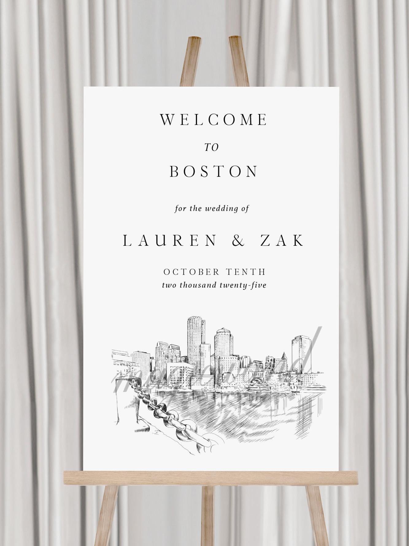 Wedding Welcome Sign Boston Skyline, Hand Drawn, Modern Wedding, Welcome Engagement Party Sign, Unique Wedding Sign, Boston Wedding Sign
