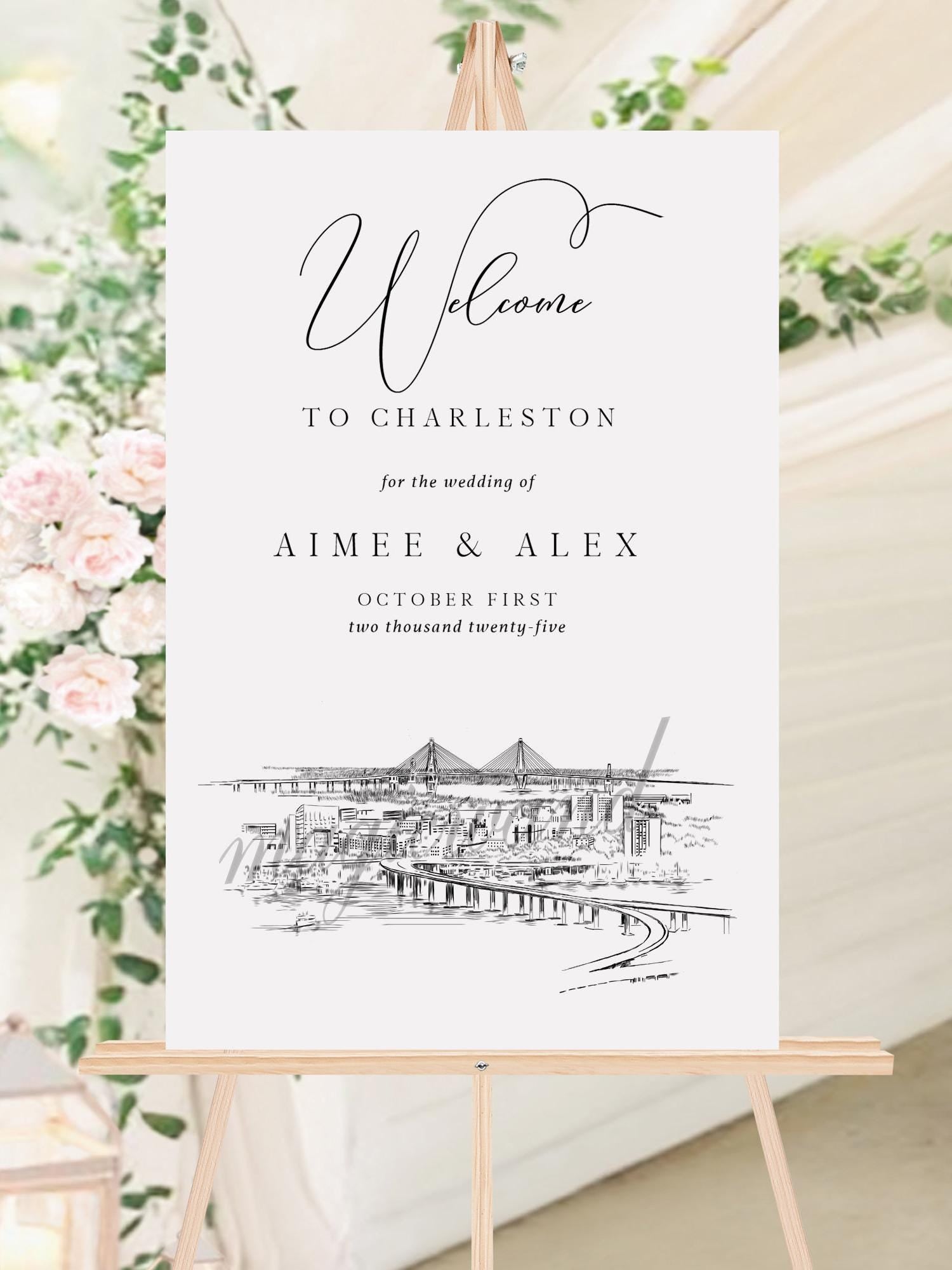 Wedding Welcome Sign Charleston Skyline, Welcome to our Wedding Sign, Hand Drawn, Modern Wedding Sign, Engagement Party Welcome Sign, Unique